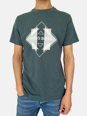 تي شيرت BOSS باللون الأخضر والأبيض ذو الرقبة المستديرة
