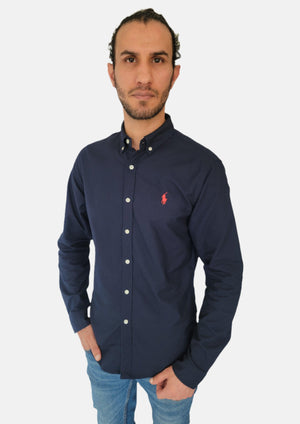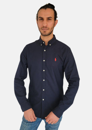قميص رجالي من رالف لورين بلون أزرق داكن سادة بقصة ضيقة صغيرة