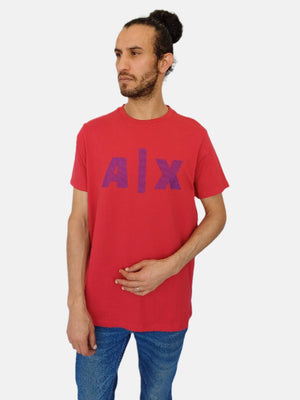 تي شيرت أرماني إكستشينج بطبعة AX باللون الأحمر والأرجواني بياقة دائرية